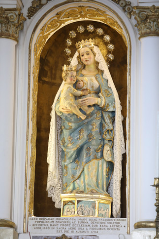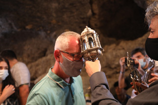 From Catania we visited many, many spiritual places. Well, this was why we came here. We went to many, many wonderful churches and sanctuaries, hear stories of amazing saints. One of the was the story of the marthyr Saint Agata in Catania itself. We enjoyed the lively city of Catania a lot. From Catania we went, of course, to the Etna. Here we visited a cave - a cave where the Madonna della Sciara was burried underneath a flow of lava. The lava stopped flowing where the statue stood. Till nowadays you can walk into the cave and see the imprint of the head of the Madonna in the lava field. It was a very special place. In general, the landscape around Mount Etna is amazing. But from time to time the villages around the mountain are covered with black ash as the vulcano is non-stop active.