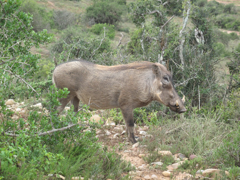 Dann war der grosse Tag gekommen. Wir schmissen die Kutsche an und fuhren im 1. Gang fuer 5 Stunden quer durch den 3980 qkm grossen Addo Park. Schon nach 1 Minute das erste wilde Tier: eine riessige Schildkroete. Kurz danach Unmengen an Warzenschweinen. Es waren so viele, wir dachten schon, diese Pumbas wurden hier erfunden. Sie sehen aber wirklich aus wie im Film! Dann bekamen wir den Tipp von einem anderen suchenden Paerchen, auf eine Offroadstrecke zu gehen, wo sie ein paar Elefanten getroffen hatten. Auf dem Weg dorthin sahen wir viele Kudus und die ersten Bueffel. Also, den ersten der Big Five haben wir dann schon gesehen. Und ploetzlich, an einem ganz schmalen Sandweg direkt vor unserem Auto standen sie: eine ganze Familie Elefanten. Von alt und riessig bis zum Mini waren alle dabei. Es war ein beeindruckendes Bild. Als der